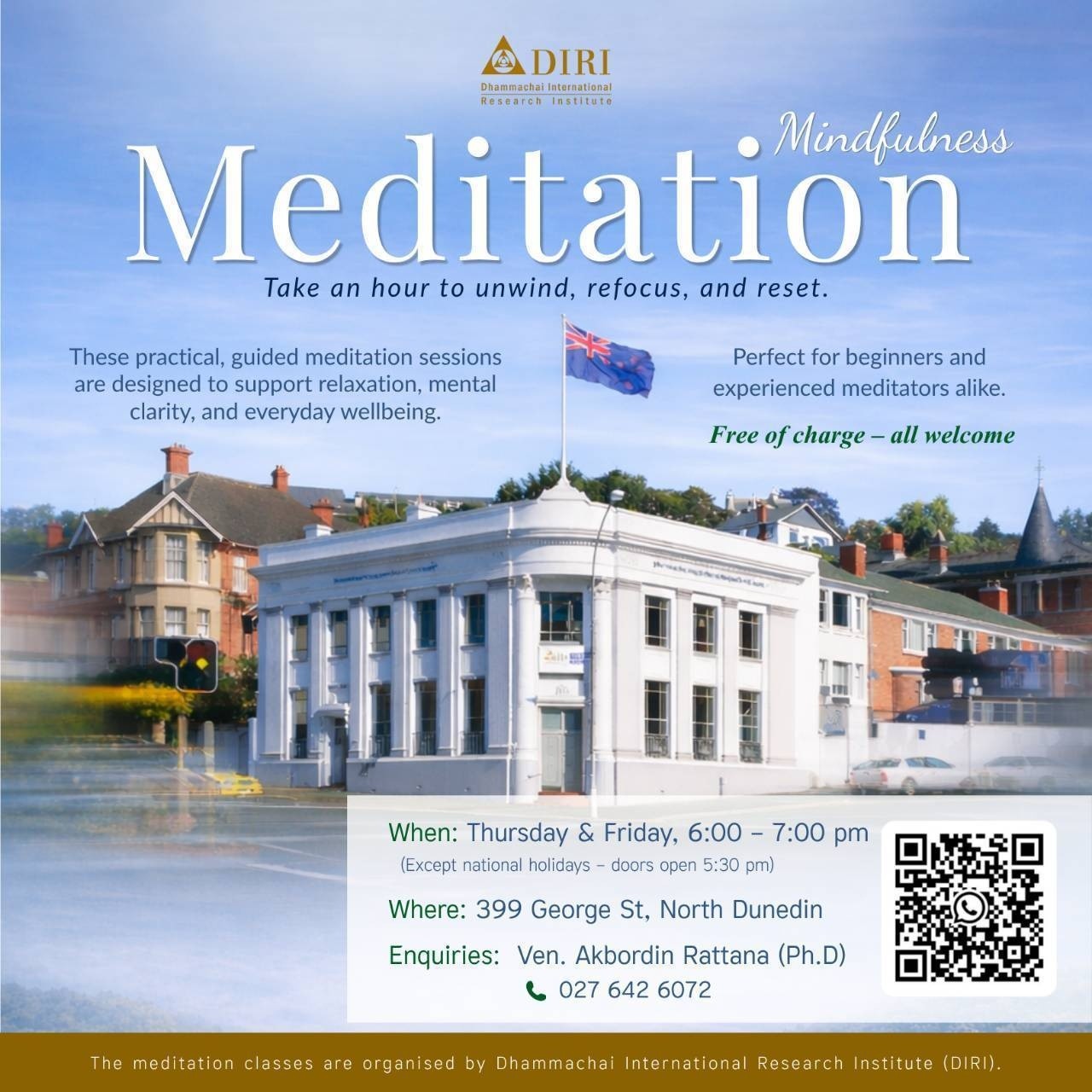 Tired after a long day? Why not stop by and give your mind a one‑hour break? Dhammachai International Research Institute (DIRI) warmly invites everyone in Dunedin to come and “reset” your inner energy in a peaceful and calming environment.Whether you are new to meditation or already have experience, we offer easy‑to‑follow guidance so you can experience...Read More